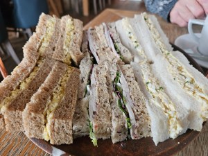 Contents (per person) – Six rectangular sandwiches (turkey and cranberry, egg mayonnaise, cheese and piccalilli, {two each of each type}). One medium/small fruit scone and one medium/small plain scone. A small bowl of strawberry jam and a small bowl of clotted cream. A mini mincemeat and banoffee pie, a chocolate and hazelnut brownie, a small square of sticky toffee, coffee and ginger sponge and a mini vanilla panna cotta with redcurrants. A pot of tea.